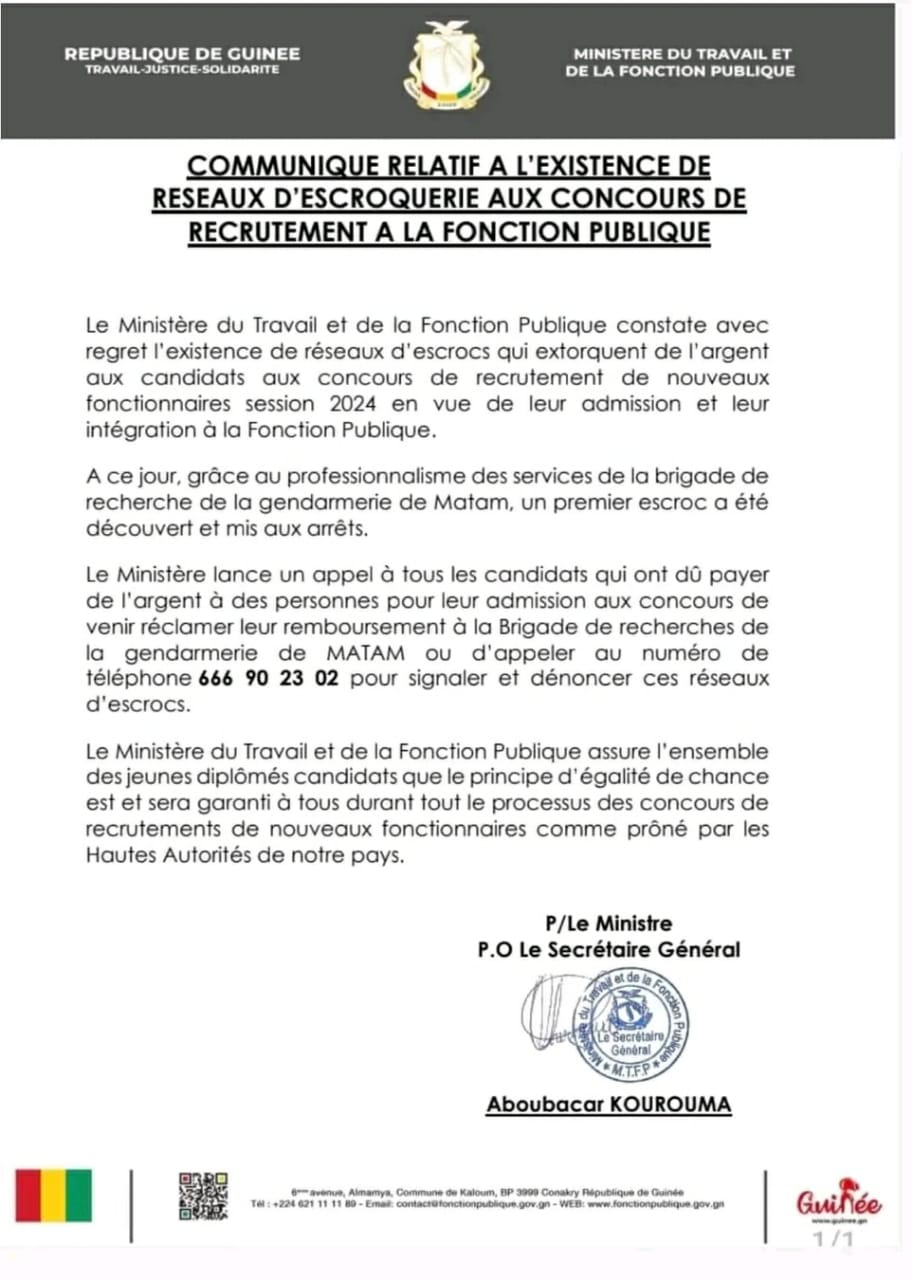 Dans un communiqué rendu public dans la soirée de ce mercredi, 12 juin 2024, le ministère du Travail et de la Fonction Publique a révélé l’existence de « réseaux d’escrocs », accusés d’extorquer de l’argent aux candidats au concours d’accès à la fonction publique. Objectif, selon ledit département, faciliter l’admission et l’intégration de ces derniers à la fonction publique.