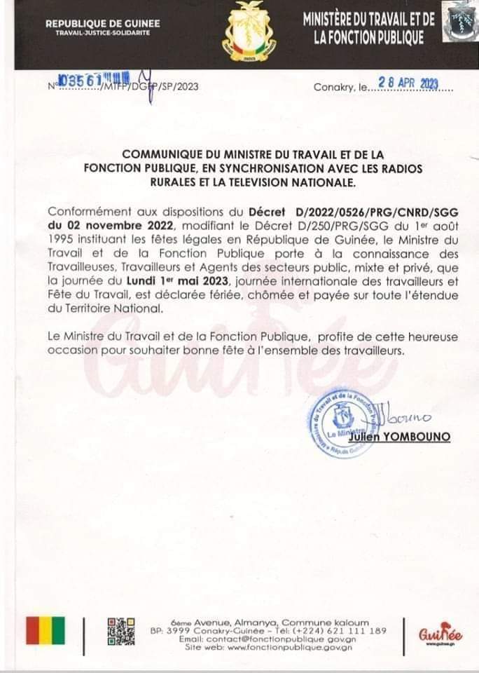 Fête internationale du travail en Guinée : la journée du lundi 1er mai déclarée fériée, chômée et payée