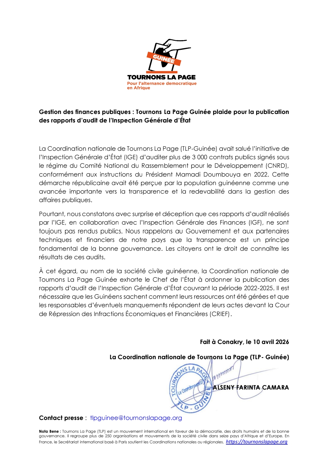 Dans un communiqué parvenu au desk de Siaminfos.com dans la nuit du vendredi, 10 avril 2026, la coordination nationale de Tournons La Page Guinée (TLP-G), fait une invite au président de la République. En effet, TLP-G dit constater avec « surprise » la « non publication » par l’Inspection Générale d’État (IGE), des rapports d’audit de plus de 3 000 contrats publics. Pour ce faire, cette plateforme de la société civile guinéenne exhorte le chef de l’État Mamadi Doumbouya à ordonner la publication desdits rapports.