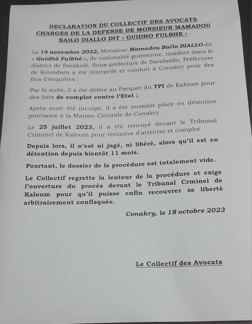 Dans une déclaration rendue publique ce 18 octobre 2023, le collectif des avocats de la défense a regretté cette lenteur de la procédure. La défense exige l’ouverture du procès devant le Tribunal criminel de Kaloum pour qu’il soit jugé.