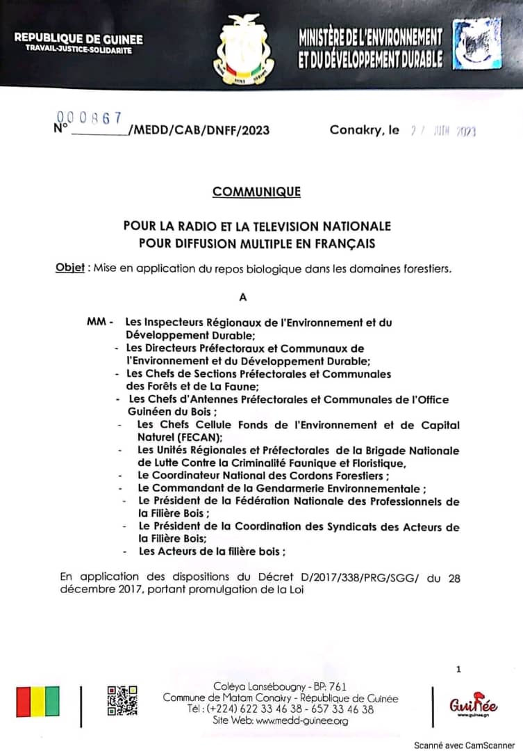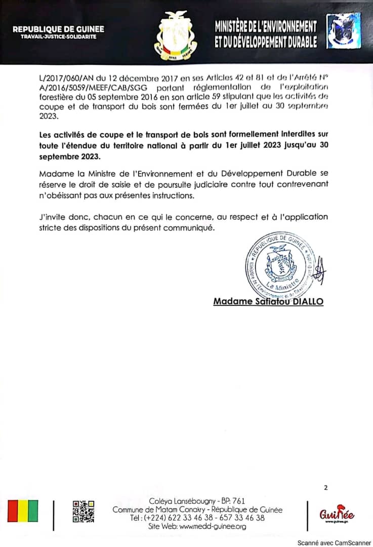 Ce, en application des dispositions du Décret D/2017/338/PRG/SGG/ du 28 décembre 2017 portant promulgation de la Loi L/2017/060/AN du 12 décembre 2017 en ses Articles 42 et 81 et de l’Arrêté N° A/2016/5059/MEEF/CAB/SGG portant réglementation de l’exploitation forestière du 05 septembre 2016 en son article 59 stipulant que les activités de coupe et de transport du bois sont fermées du 1er juillet au 30 septembre 2023.