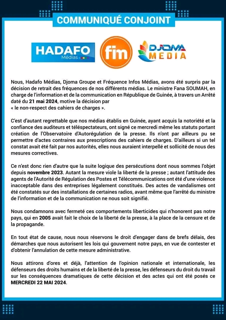 Guinée : Hadafo Médias, FIM FM et Djoma Média brisent le silence après le retrait de leurs agréments et fréquences