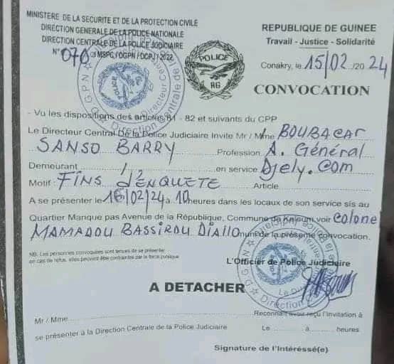 Une convocation a été adressée ce jeudi, 15 février 2024 à l’administrateur général du site ledjely.com. Boubacar Sanso Barry puisqu’il s’agit de lui, est convoqué par la Direction centrale de la police judiciaire (DCPJ). Dans cette convocation dont Siaminfos.com détient copie, la DCPJ ne donne pas les raisons pour lesquelles le journaliste est convoqué.