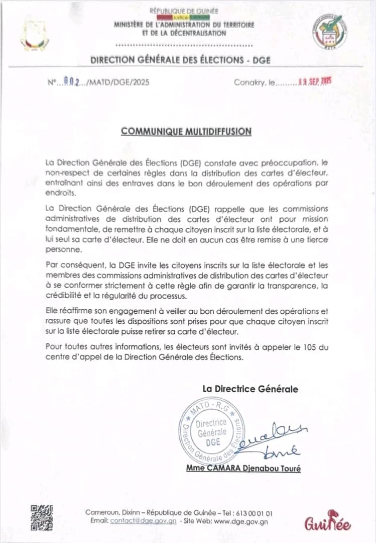 A quelques jours du référendum constitutionnel prochain, la distribution des cartes d’électeurs a débuté samedi, 6 septembre 2025 en Guinée. Alors que des anomalies sur certaines cartes deviennent de plus en plus virales sur les réseaux, la Direction Générale des Élections (DGE) se fait entendre. Dans un communiqué dont Siaminfos.com détient copie, la DGE dit constater avec « préoccupation » le non-respect de certaines règles dans la distribution de ces cartes d’électeurs.
