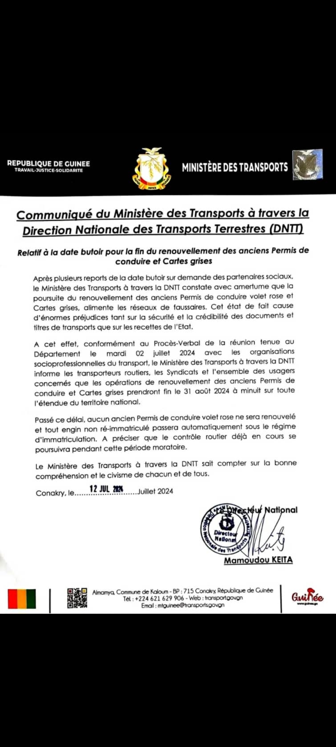 Dans un communiqué rendu public ce vendredi, 12 juillet 2024 et dont Siaminfos.com détient copie, la direction nationale des transports terrestres (DNTT) a annoncé la fin du renouvellement des anciens permis de conduire et cartes grises le 31 août prochain, en Guinée.