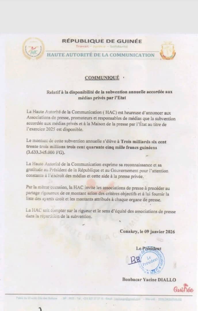 Dans un communiqué rendu public ce vendredi, 9 janvier 2026, la Haute Autorité de la Communication (HAC) annonce la disponibilité de la subvention accordée aux médias privés. Il s’agit de la subvention relative à l’exercice 2025 dont le montant s’élève à 3 633 345 000 de francs guinéens. D’ores et déjà, l’instance de régulation des médias en Guinée invite les ayant-droits à procéder au partage « équitable » de cette somme selon des critères « objectifs ». Dans son communiqué, la HAC demande la liste des ayant-droits et les montants attribués à chaque organe de presse.