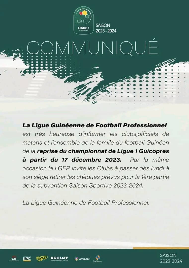 Dans un communiqué parvenu au desk de Siaminfos.com ce vendredi, 8 décembre 2023, la Ligue guinéenne de football professionnel (LGFP) a annoncé la reprise du championnat national de ligue 1 Guicopress. La date retenue pour cette reprise est fixée au 17 décembre courant.