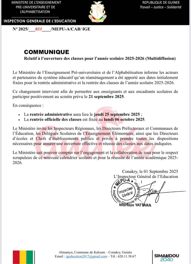 Le ministère guinéen de l’Enseignement Pré-Universitaire et de l’Alphabétisation, vient de reporter à nouveau la rentrée scolaire session 2026 et celle administrative.