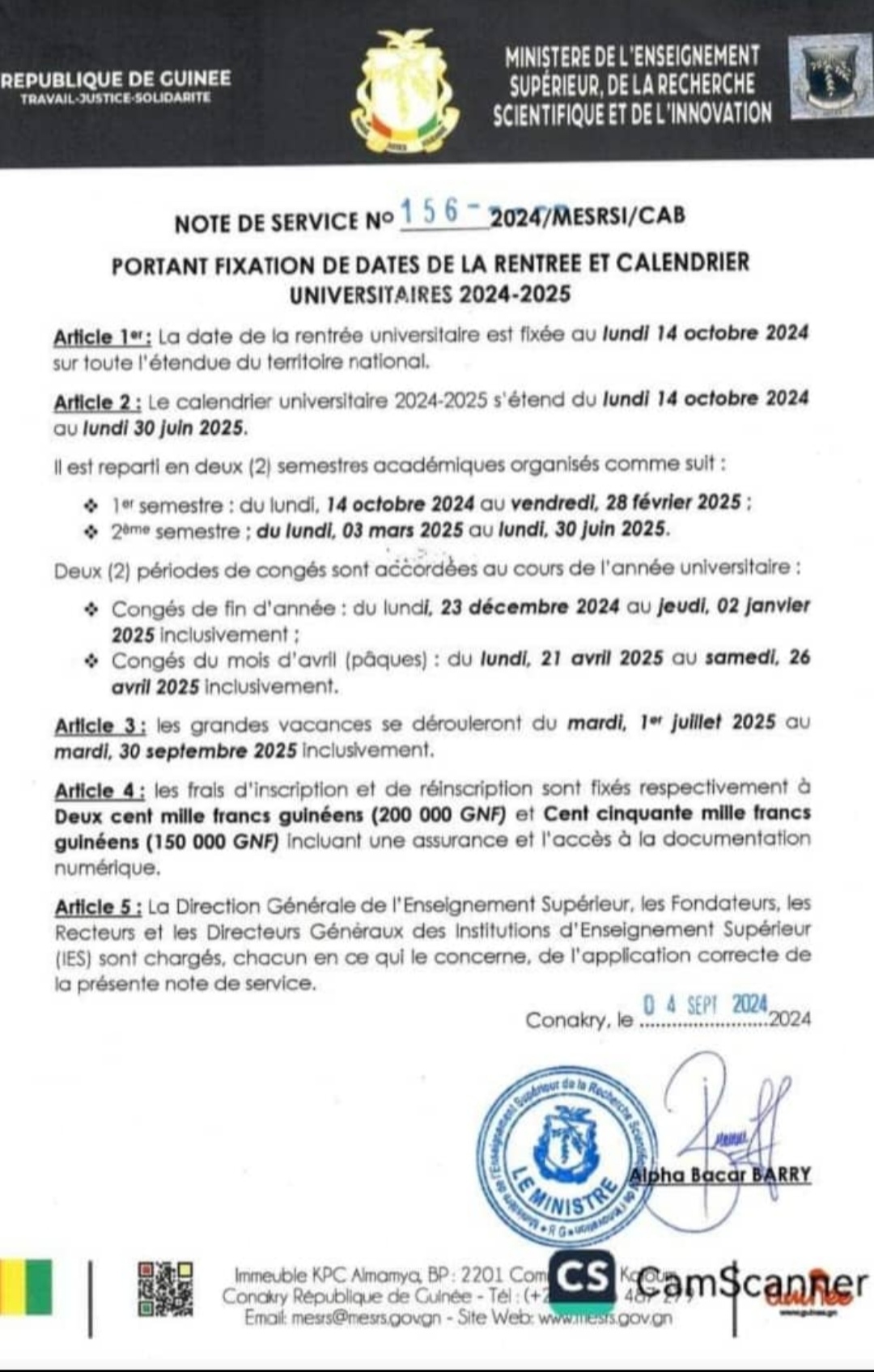 C’est désormais officiel. Les étudiants guinéens reprennent le chemin des institutions d’enseignement supérieur du pays le 14 octobre prochain. L’annonce a été faite ce mercredi, 4 septembre 2024 par le ministère de l’Enseignement Supérieur, de la Recherche Scientifique et de l’Innovation, à travers une note circulaire dont Siaminfos.com détient copie.