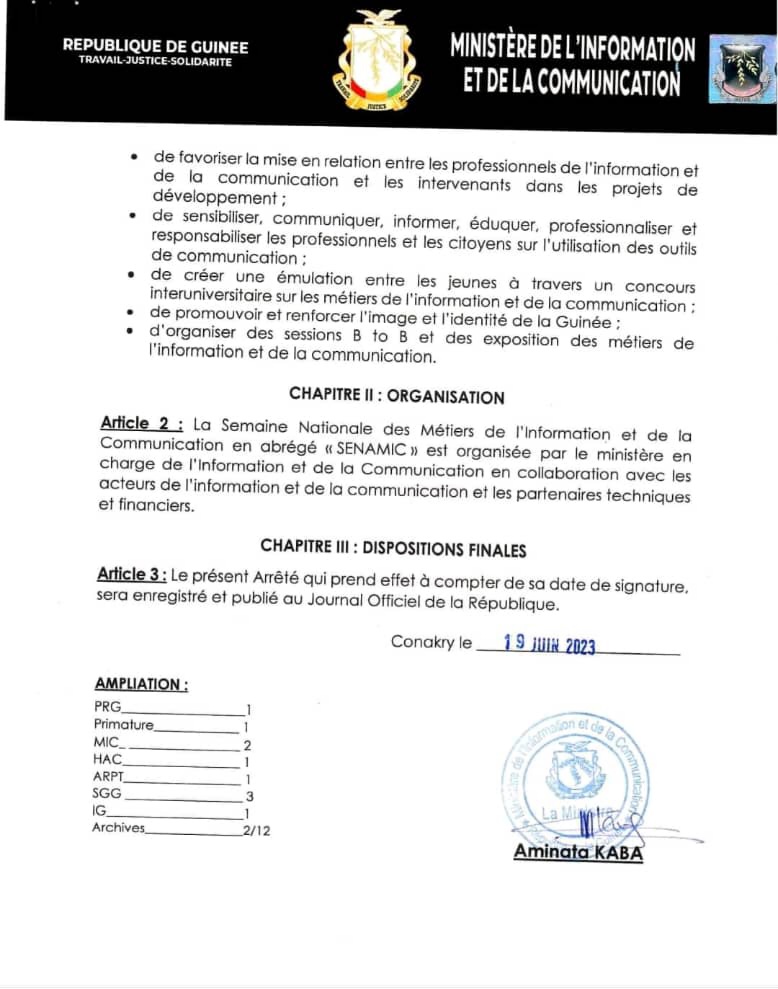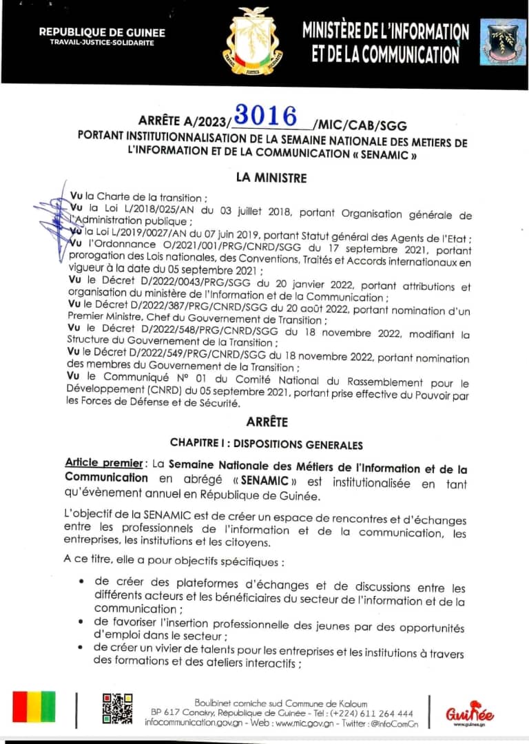 Dans un arrêté en date du 19 juin dernier et rendu public ce lundi, 26 juin 2023, la ministre de l’Information et de la Communication, a institutionnalisé la Semaine nationale des métiers de l’Information et de la Communication (SENAMIC), en tant qu’événement annuel en République de Guinée.