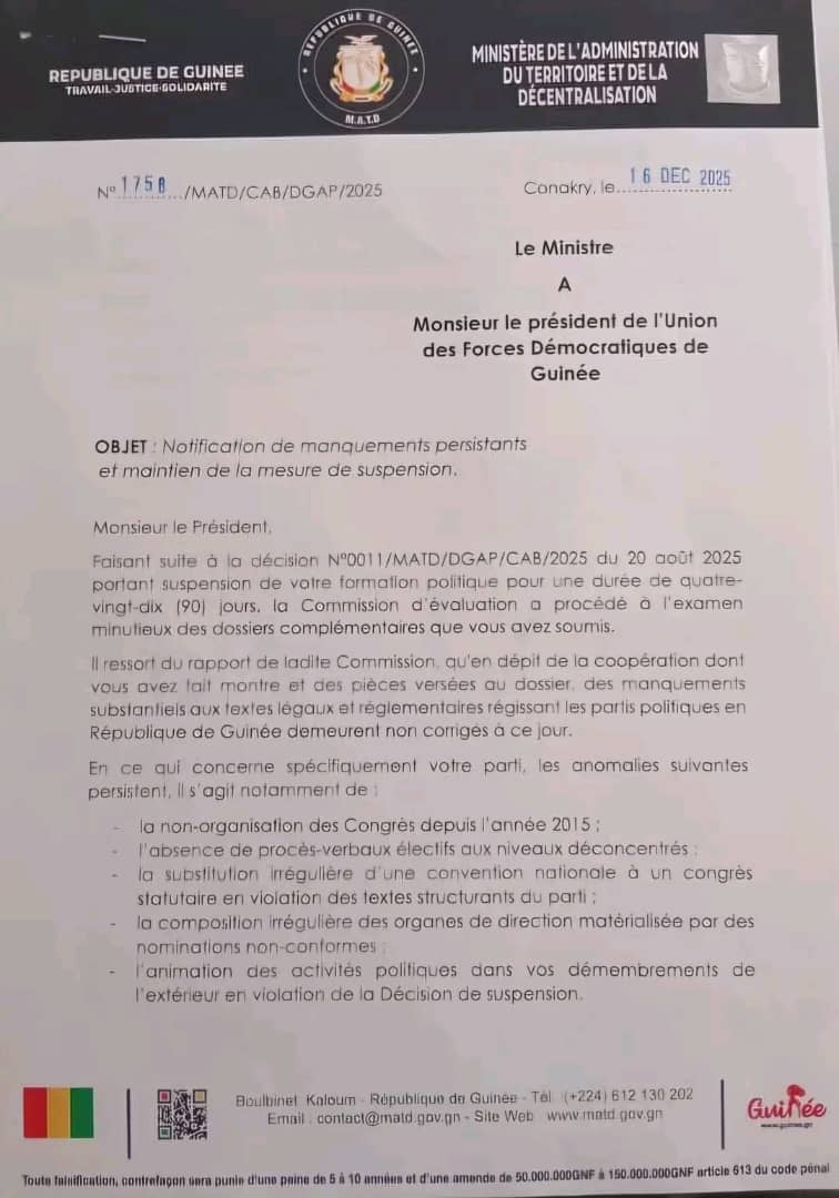 Dans un communiqué en date du 11 décembre 2025, la direction nationale de l’Union des Forces Démocratiques de Guinée (UFDG) a annoncé la reprise prochaine des activités du parti. Une reprise qui devra encore attendre, puisque le ministère de l’Administration du Territoire et de la Décentralisation (MATD) vient de maintenir la mesure de suspension du parti.