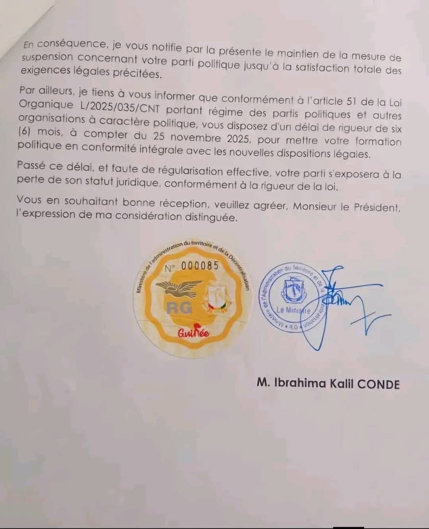 Dans un courrier adressé au président de l’UFDG Cellou Dalein Diallo, le ministre Ibrahima Kalil Condé motive cette décision par des « manquements substantiels aux textes légaux et réglementaires régissant les partis politiques en Guinée ». Plus loin, le MATD souligne des anomalies « persistantes » au sein de l’UFDG, notamment la « non organisation » des congrès du parti depuis 2025. Un délai de six mois a été accordé à l’UFDG pour se mettre en « conformité intégrale avec les nouvelles dispositions légales », peut-on lire dans le courrier du ministre Ibrahima Kalil Condé.
