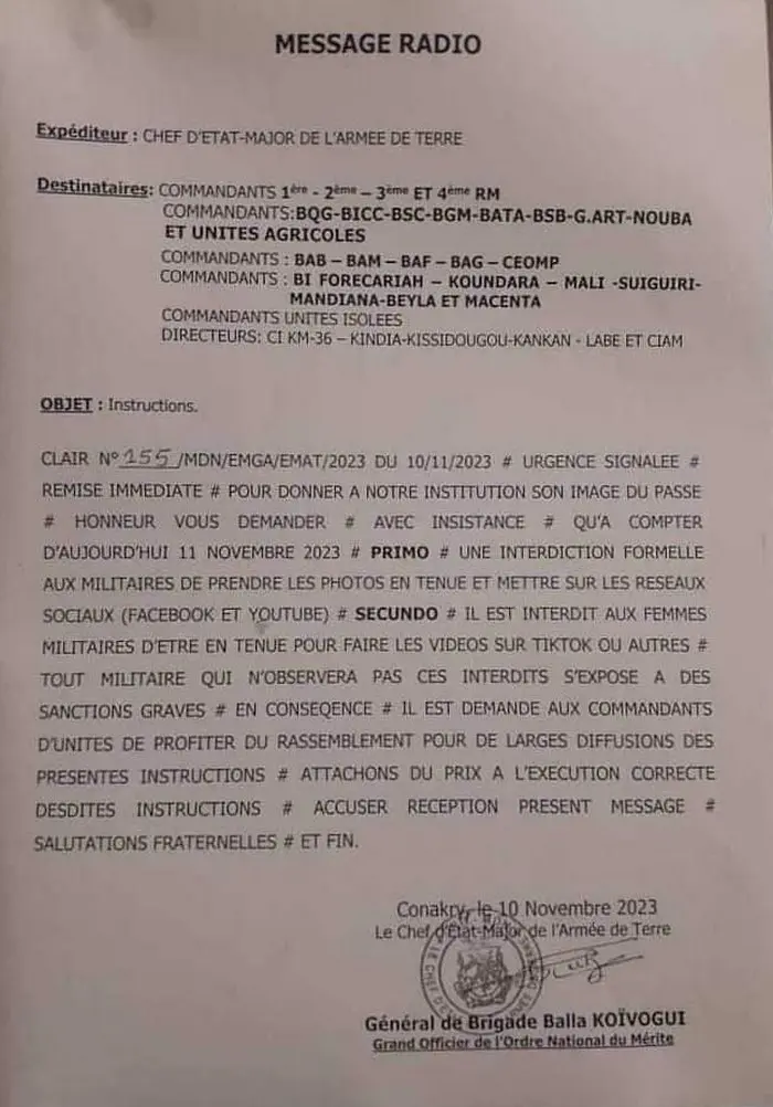 Vraisemblablement, c’est une mise en garde non voilée que le chef d’état-major de l’armée de terre vient d’envoyer aux militaires. En effet, il est dorénavant interdit à ces derniers de se prendre en photo en tenue militaire et de poster leurs photos sur les réseaux sociaux à savoir Facebook et YouTube. Plus loin, le général de brigade Balla Koïvogui a mis en garde les femmes militaires qui feraient des vidéos sur TikTok en tenue militaire. Par ailleurs, le chef d’état-major de l’armée de terre prévient que les contrevenants s’exposeraient à des « sanctions graves ». Ci-dessous, plus de précisions !