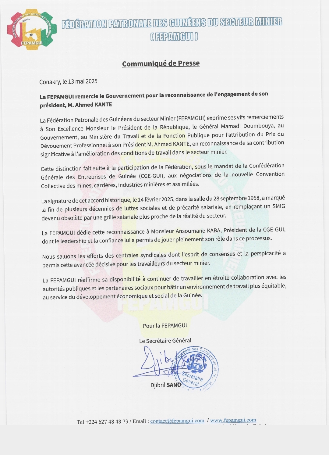 Dans son communiqué, la FEPAMGUI promet de continuer sa collaboration avec les autorités publiques et les partenaires pour promouvoir un environnement de travail plus « équitable au service du développement économique et social de la Guinée ».