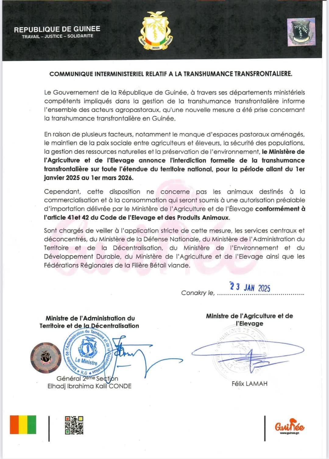 Dans un communiqué interministériel rendu public dans la nuit du jeudi, 23 janvier 2024, les ministères de l’Administration du Territoire, de l’Agriculture et de l’Élevage annoncent l’interdiction de la transhumance transfrontalière sur l’ensemble du territoire national. Cette interdiction formelle va du 1er janvier courant au 1er mars 2026. Les autorités motivent cette décision par le manque d’espaces pastoraux aménagés, le maintien de la paix sociale entre agriculteurs et éleveurs, la sécurité des populations, la gestion des ressources naturelles ou encore la préservation de l’environnement.
