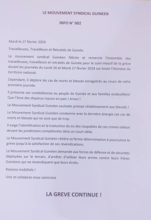 Par ailleurs, le Mouvement Syndical Guinéen réitère sa ferme détermination à poursuivre la grève jusqu’à la satisfaction de ses revendications.