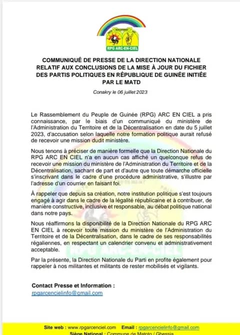 Le ministère de l’Administration du Territoire et de la Décentralisation a rendu public mercredi dernier un rapport sur sa mission d’inspection dans les QG des partis politiques. Dans le rapport, le département dirigé par Mory Condé révèle que certains partis politiques n’ont pas dénié recevoir la mission. Parmi lesquels, figurerait le RPG arc-en-ciel, ancien parti au pouvoir. Dans un communiqué parvenu au desk de Siaminfos.com, le parti de l’ex président Alpha Condé a démenti ce rapport.