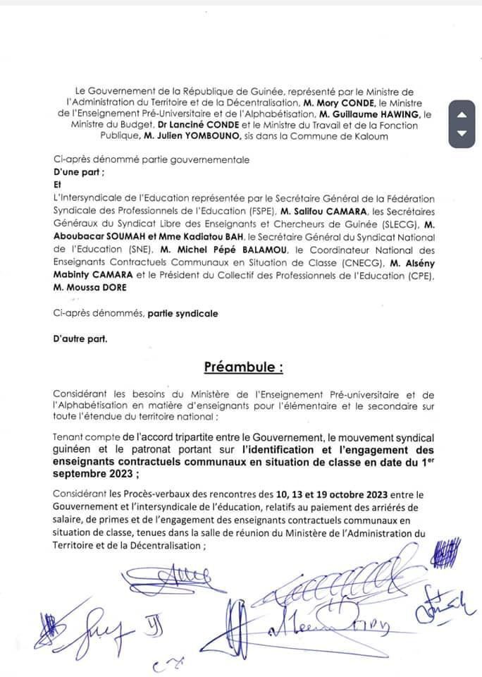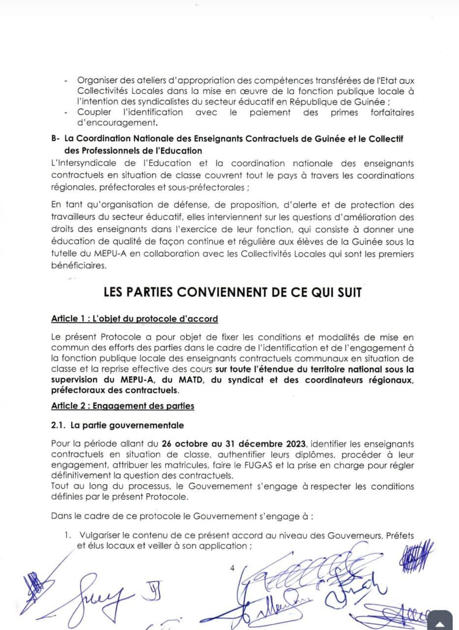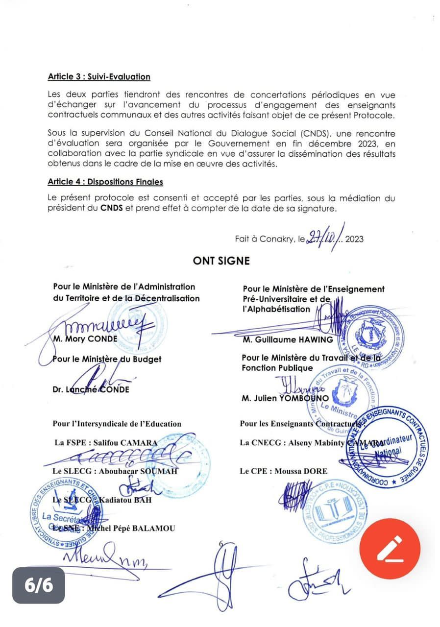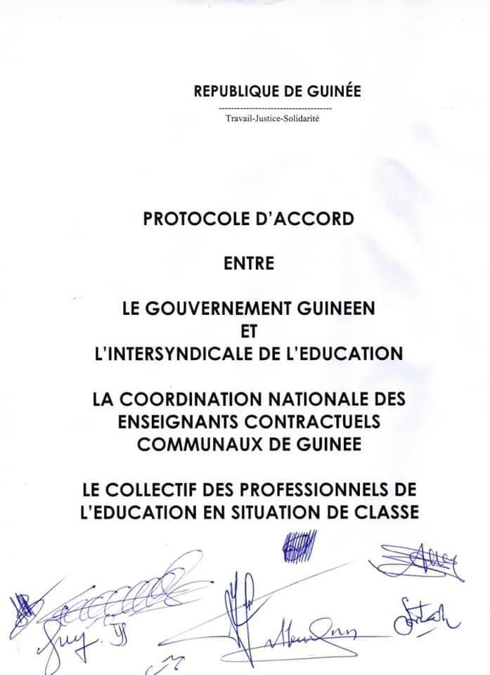 Les parties se sont toutes engagées à respecter ce protocole d’accord pour le retour des enseignants contractuels en classe et pour le bonheur de l’école guinéenne.