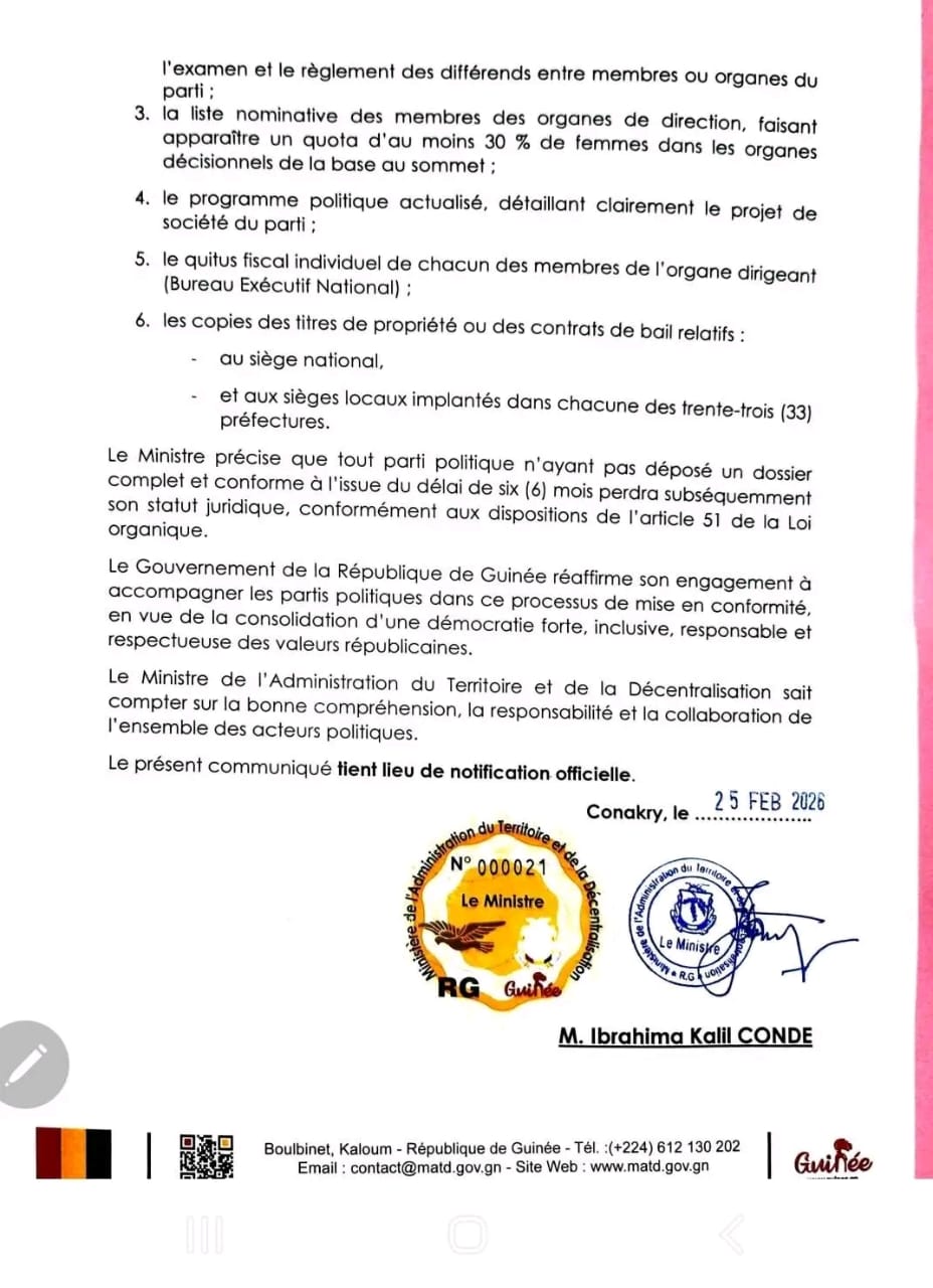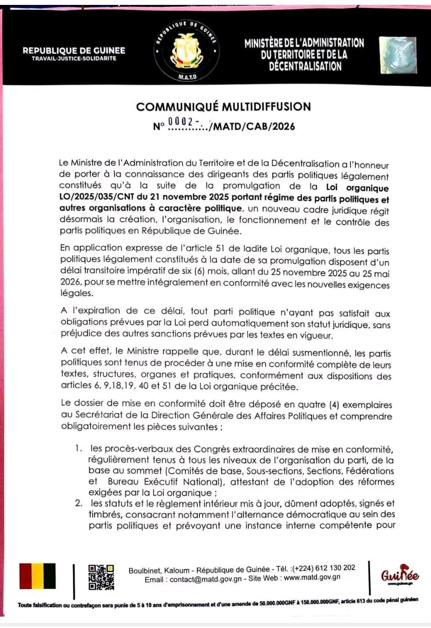 Dans un communiqué en date du 25 février 2026, le ministre de l’Administration du Territoire et de la Décentralisation (MATD) a sommé les partis politiques légalement constitués en Guinée de régulariser leur situation dans un délai de six (6) mois, allant du 25 novembre 2025 au 25 mai 2026, pour se mettre intégralement en conformité avec les nouvelles exigences.
