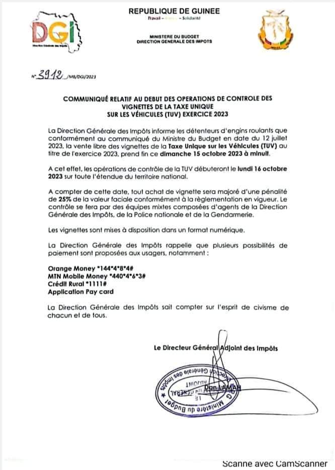 Dans un communiqué parvenu au desk de Siaminfos.com, la direction générale des impôts a porté à la connaissance de l’opinion, le début des opérations de contrôle des vignettes de la taxe unique sur les véhicules (TUV). Dans ledit communiqué, il est indiqué que les opérations débutent le lundi, 16 octobre 2023, sur l’ensemble du territoire national.