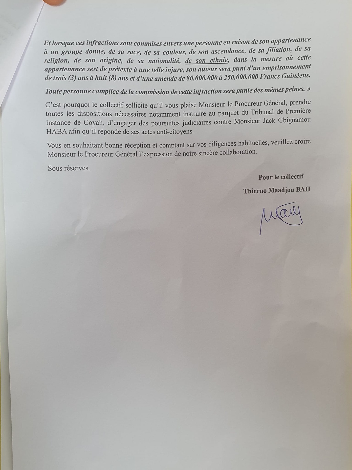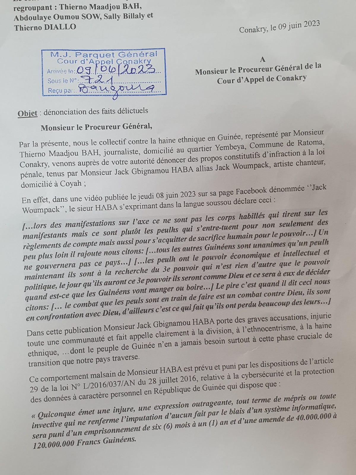 Vraisemblablement, la sortie de l’artiste chanteur Jack Woumpack a irrité la colère d’une communauté. Un collectif dirigé par le journaliste Thierno Maadjou Bah, vient de solliciter auprès du procureur général près la Cour d’appel de Conakry, des poursuites judiciaires contre l’artiste. Dans le courrier, le collectif dénonce des propos « ethnocentriques » et invite à l’application stricte de la loi. Pour le collectif, Jack Woumpack doit répondre de ses actes « anti-citoyens ».