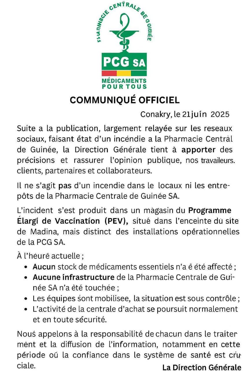 Dans un communiqué parvenu au Desk de Siaminfos.com ce samedi, 21 juin 2025, la direction générale de la Pharmacie centrale de Guinée parle plutôt d’un incendie survenu dans « un magasin du Programme Élargi de Vaccination (PEV), situé dans l’enceinte du site de Madina, mais distinct des installations opérationnelles de la PCG SA », précise-t-elle.