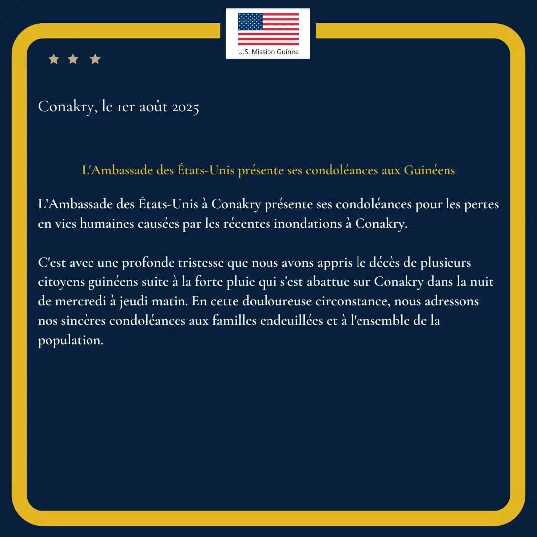 Dans un message rendu public ce vendredi, 1er août 2025, les États-Unis, par le biais de leur représentation diplomatique dans le pays, ont exprimé leur solidarité à la Guinée. Quelques heures plutôt, l’ANGUCH a annoncé des mesures en faveur des victimes avant d’appeler la population à la vigilance.