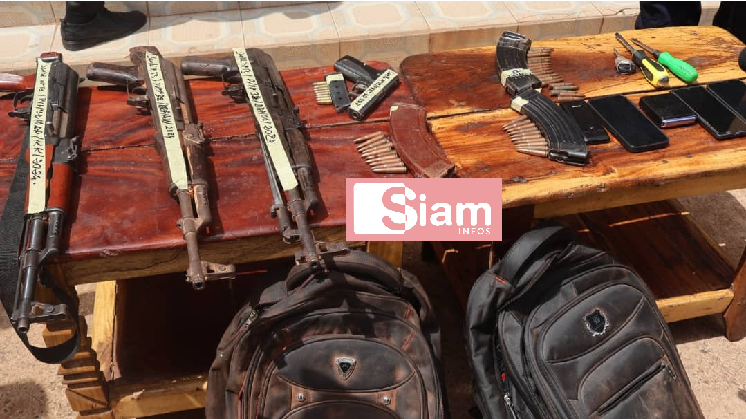 « Laye Moriba Condé, alias boutiquier, le fugitif de l’attaque à main armée perpétrée contre un kiosque d’Orange Money le 17 avril 2024 à 15 heures 40 dans le quartier de Kabada 1, au préjudice de Monsieur Abou Kourouma, où un montant de 17.000.000 FG (dix-sept millions de francs guinéens) a été volé et un paisible citoyen du nom de Monsieur Toya Toupou fusillé lors de l’opération, lequel a succombé de ses blessures à l’Hôpital Régional de Kankan. Ce suspect est également détenteur de deux armes de guerre de type AK47 et d’un pistolet automatique. Il est aussi l’organisateur de l’attaque à main armée et de l’évasion des détenus de la prison civile de Siguiri en 2023. Djibril Camara, alias Dabi, est détenteur d’une arme de guerre (un AK47) et s’était également évadé de la prison civile de Kankan le 18 juillet 2023 à l’aide d’un pistolet automatique. Mamadi Kobaya Condé, adjudant de l’armée de terre, chargé d’assurer le transport des armes du point de cache aux lieux d’opérations, vend également des munitions et des armes de guerre. Enfin, Oumar Camara, alias Bongo, résidant à Bouré, préfecture de Siguiri, chargé de la garde des armes après les opérations d’attaques. Au total, trois (03) AK47, trois (03) boîtes chargeurs, trente-sept (37) cartouches (AK47), un pistolet automatique (cal) et sa boîte chargeur garnie de huit (08) cartouches ont été retrouvés chez lui. Ces individus seront déférés au parquet d’instance ce jour de mai 2024 pour des faits présumés d’association de malfaiteurs, vol à main armée, meurtre, détention illicite d’armes de guerre, de munitions et d’évasion, faits prévus et punis par les articles 784, 381, 206, 848 du code pénal. »