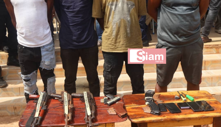 « Laye Moriba Condé, alias boutiquier, le fugitif de l’attaque à main armée perpétrée contre un kiosque d’Orange Money le 17 avril 2024 à 15 heures 40 dans le quartier de Kabada 1, au préjudice de Monsieur Abou Kourouma, où un montant de 17.000.000 FG (dix-sept millions de francs guinéens) a été volé et un paisible citoyen du nom de Monsieur Toya Toupou fusillé lors de l’opération, lequel a succombé de ses blessures à l’Hôpital Régional de Kankan. Ce suspect est également détenteur de deux armes de guerre de type AK47 et d’un pistolet automatique. Il est aussi l’organisateur de l’attaque à main armée et de l’évasion des détenus de la prison civile de Siguiri en 2023. Djibril Camara, alias Dabi, est détenteur d’une arme de guerre (un AK47) et s’était également évadé de la prison civile de Kankan le 18 juillet 2023 à l’aide d’un pistolet automatique. Mamadi Kobaya Condé, adjudant de l’armée de terre, chargé d’assurer le transport des armes du point de cache aux lieux d’opérations, vend également des munitions et des armes de guerre. Enfin, Oumar Camara, alias Bongo, résidant à Bouré, préfecture de Siguiri, chargé de la garde des armes après les opérations d’attaques. Au total, trois (03) AK47, trois (03) boîtes chargeurs, trente-sept (37) cartouches (AK47), un pistolet automatique (cal) et sa boîte chargeur garnie de huit (08) cartouches ont été retrouvés chez lui. Ces individus seront déférés au parquet d’instance ce jour de mai 2024 pour des faits présumés d’association de malfaiteurs, vol à main armée, meurtre, détention illicite d’armes de guerre, de munitions et d’évasion, faits prévus et punis par les articles 784, 381, 206, 848 du code pénal. »
