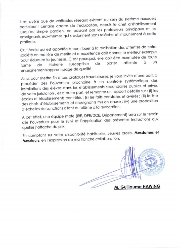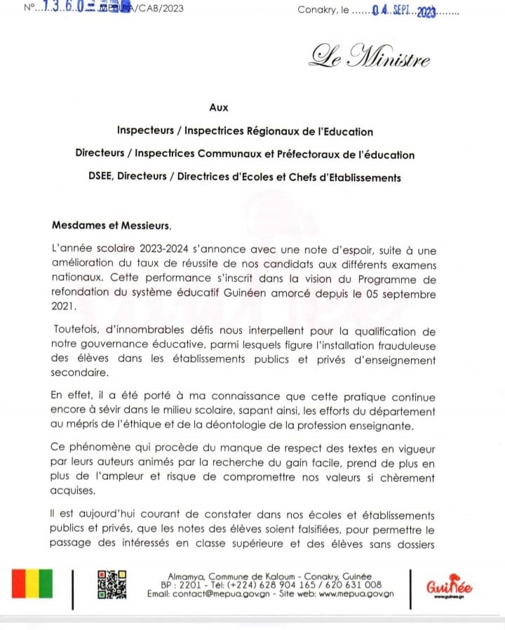 C’est dans cette dynamique que le ministre de l’Enseignement Pré-universitaire et de l’Alphabétisation, s’est fendu d’une note circulaire pour interpeler les inspecteurs et inspectrices, directeurs communaux de l’éducation, ainsi les chefs d’établissements chacun sur sa responsabilité afin de pouvoir barrer la route à cette pratique.