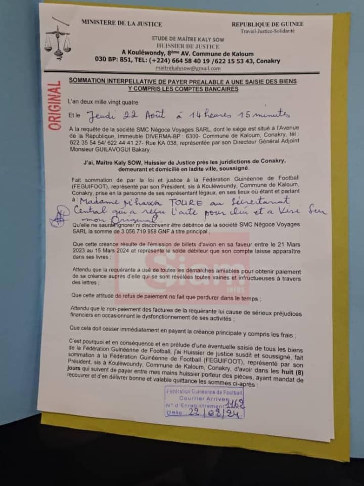 C’est un nouveau problème qui surgit au sein de la Fédération guinéenne de football (Feguifoot), qui faisait déjà face à d’autres problèmes liés à la Gestion du président Bouba Sampil. En effet, le jeudi, 22 août 2024, un huissier de justice du nom de Maître Kaly SOW, a précisé une sommation à la Fédération Guinéenne de Football (FEGUIFOOT), représentée par son Président, concernant une dette envers la société SMC Négoce Voyage SARL.