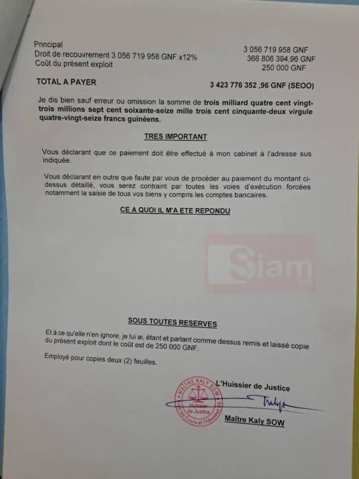 Dans le courrier, l’huissier exige le paiement de cette somme de 3 056 719 968 GNF, y compris les frais, dans un délai de huit jours pour éviter une saisie des biens de la fédération.