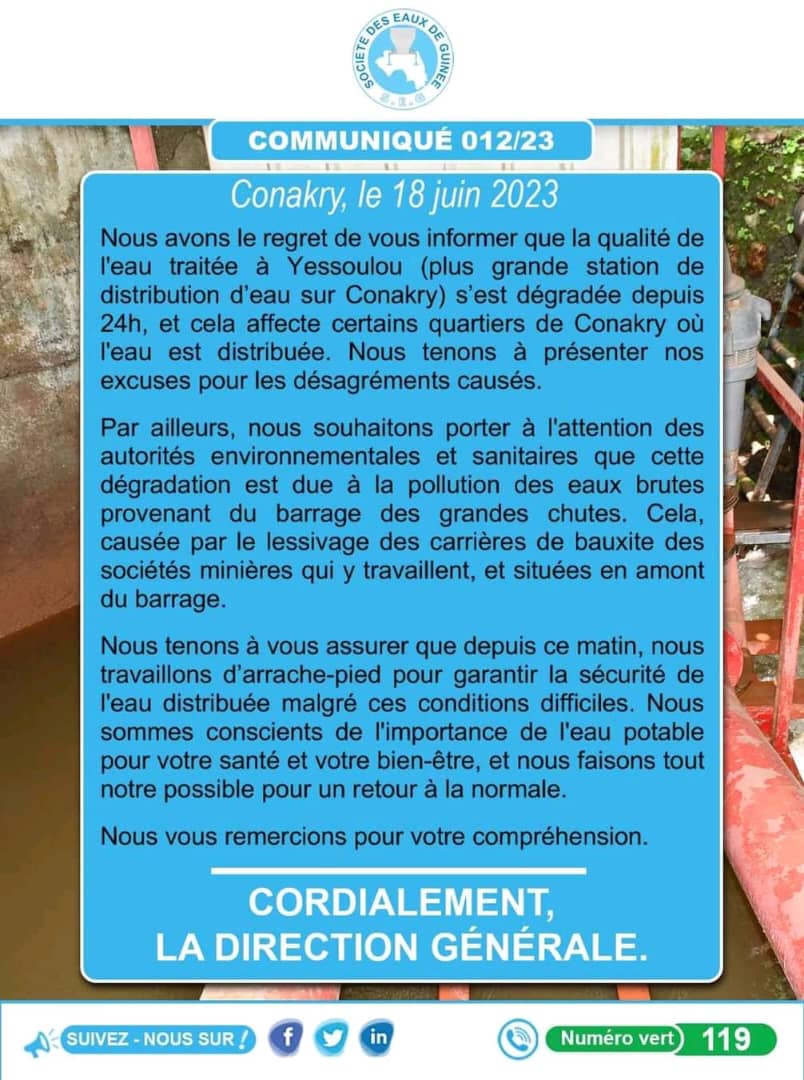 A travers un communiqué rendu public ce 18 juin 2023, la direction générale de la Société des Eaux de Guinée (SEG) a informé les citoyens de Conakry que la qualité de l’eau traitée à Yessoulou (plus grande station de distribution d’eau sur Conakry) s’est dégradée depuis 24h, et cela affecte certains quartiers de Conakry où l’eau est distribuée.