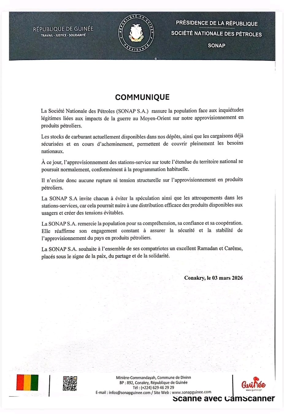 Depuis la matinée de ce 3 mars 2026, les stations services sont prises d’assaut à Conakry. En cause, la guerre en cours actuellement au Moyen-Orient. Si d’aucuns estiment qu’une crise de carburant pointe déjà à l’horizon en Guinée, la Société Nationale des Pétroles (SONAP) tente de rassurer l’opinion. Dans un communiqué rendu public ce jour, la SONAP affirme que le pays dispose de stocks suffisants.