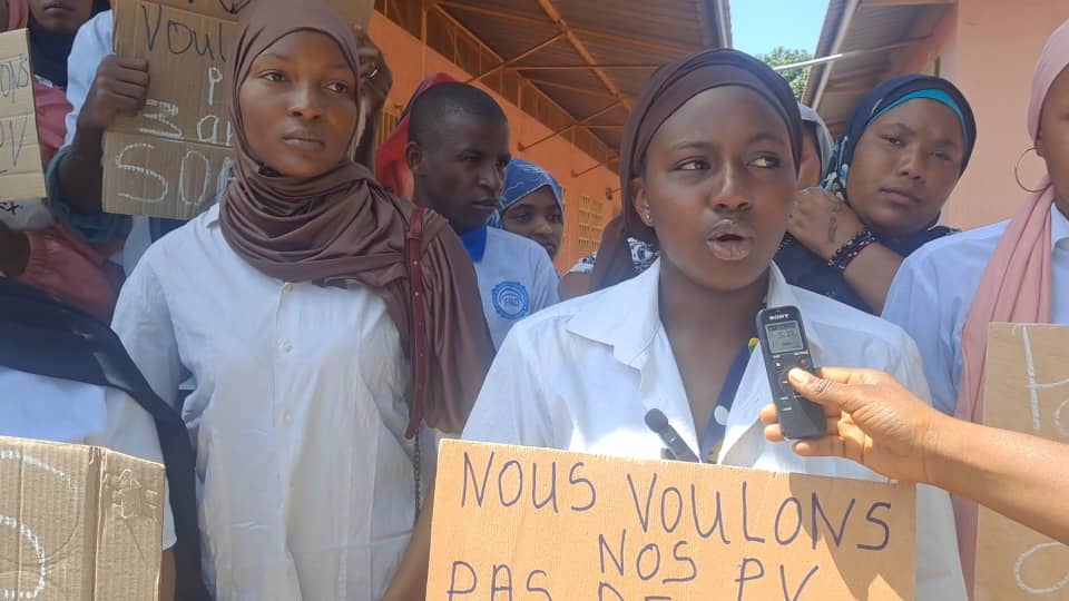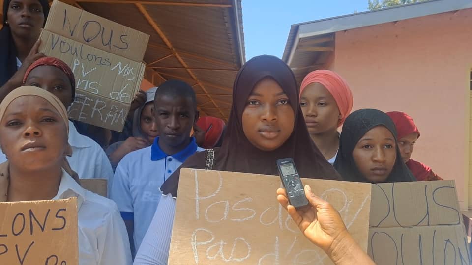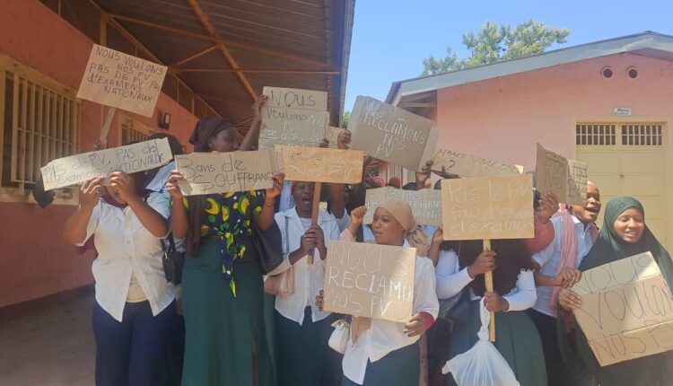 « C’est le week-end dernier que nous avons été appelés par certains responsables de notre école pour aller vérifier nos PV. Personnellement, y compris certains de mes collègues, nous n’avons jusque-là pas reçu les PV. C’est pourquoi ce matin, nous nous sommes mobilisés pour attirer l’attention des autorités sur notre situation. Nous avons étudié durant trois ans grâce surtout à l’effort financier de nos parents. Donc, il est inconcevable que tout cet argent se volatilise dans la nature. Il y a certains de nos collègues qui ont reçu leurs PV, mais ils ne veulent pas aller composer sans nous. Nous invitons donc les autorités à faire tout pour que nous entrons en possession de ces PV. S’il faut même, ils peuvent procéder à un décalage de ces examens de sortie. C’est pourquoi ce matin, nous avons décidé de nous faire entendre à partir du CFP de Labé et ensuite au gouvernorat pour attirer l’attention du gouverneur », a-t-elle indiqué avant qu’Aïssatou Diallo, une autre manifestante ne renchérisse: « Nous sommes devant les locaux du CFP pour demander à ce que nos collègues soient rétablis dans leurs droits. Moi, j’ai reçu mon PV mais pas la carte. Au niveau de notre école Ahmadou Dieng, le nombre de cartes disponibles ne correspond pas au nombre d’étudiants qui doivent affronter ces examens de sortie. Dès le premier jour de l’école, on te somme de payer une somme de 250.000 gnf. Selon les responsables, les 200 mille francs guinéens, c’est pour eux et les 50 milles, c’est pour l’inscription dans la plateforme. D’ailleurs à l’inscription, vous ne rentrez pas en classe sans payer ce montant. C’est hier qu’on a compris que beaucoup de nos collègues n’ont pas été inscrits sur la plateforme. Il y a beaucoup de nos collègues qui n’ont pas reçu à date leurs PV. Si rien n’est fait pour ces PV, nous avons décidé de boycotter ces examens de sortie », a-t-elle menacé.