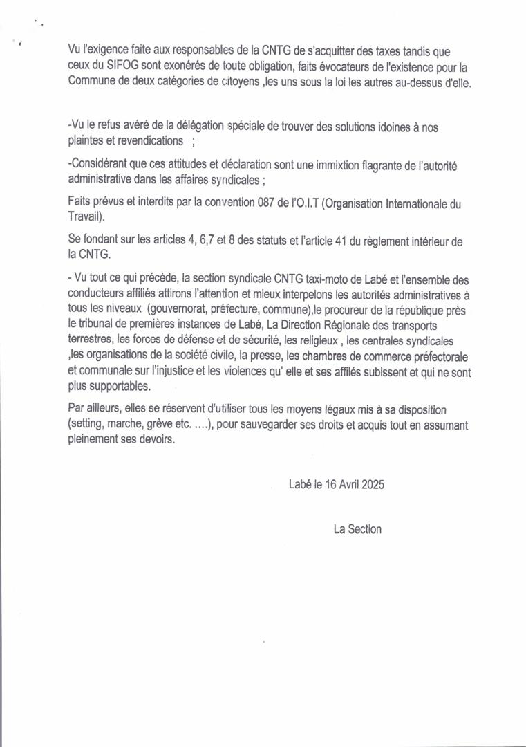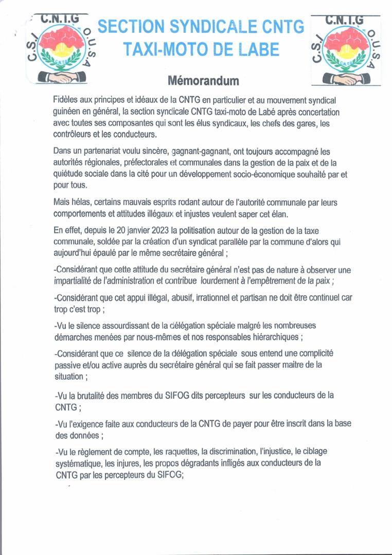 « Pour la petite histoire, c’est l’ancienne équipe du maire Mamadou Aliou Laly Diallo qui avait résilié le contrat de perception de taxes de stationnement que nous avions signé avec eux. De discussion en discussion, ils ont finalement créé une section syndicale et ils ont pris le tour pour confier à cette section syndicale dénommée SIFOG. Pendant deux ans, nous étions en observation et il s’est révélé qu’ils sont en train de faire du deux poids deux mesures. Nos conducteurs et responsables syndicaux sont victimes d’humiliation, de manque de respect, d’insultes et d’injustice. Si un conducteur affilié à la CNTG se rend à la commune, on lui fait payer soit 10.000 ou 15.000 gnf pour l’inscrire dans la base de données. Finalement, leurs motos sont immobilisées durant des jours quand ces conducteurs sont pris en ville. S’il s’agit des conducteurs affiliés au SIFOG, ils ne payent rien exceptés ces droits de stationnement. A côté, les percepteurs laissent les responsables de gare affiliés au SIFOG pour contraindre nos responsables de payer. On s’est retrouvés, nous de la CNTG et nos responsables nous ont remonté les informations sur le terrain. Nous avons fait des démarches et rencontré les autorités communales avec lesquels nous avons échangé plus de dix fois. Nos responsables de la région sont allés échanger avec eux mais malheureusement, cela n’a pas abouti », a-t-il fait cas.