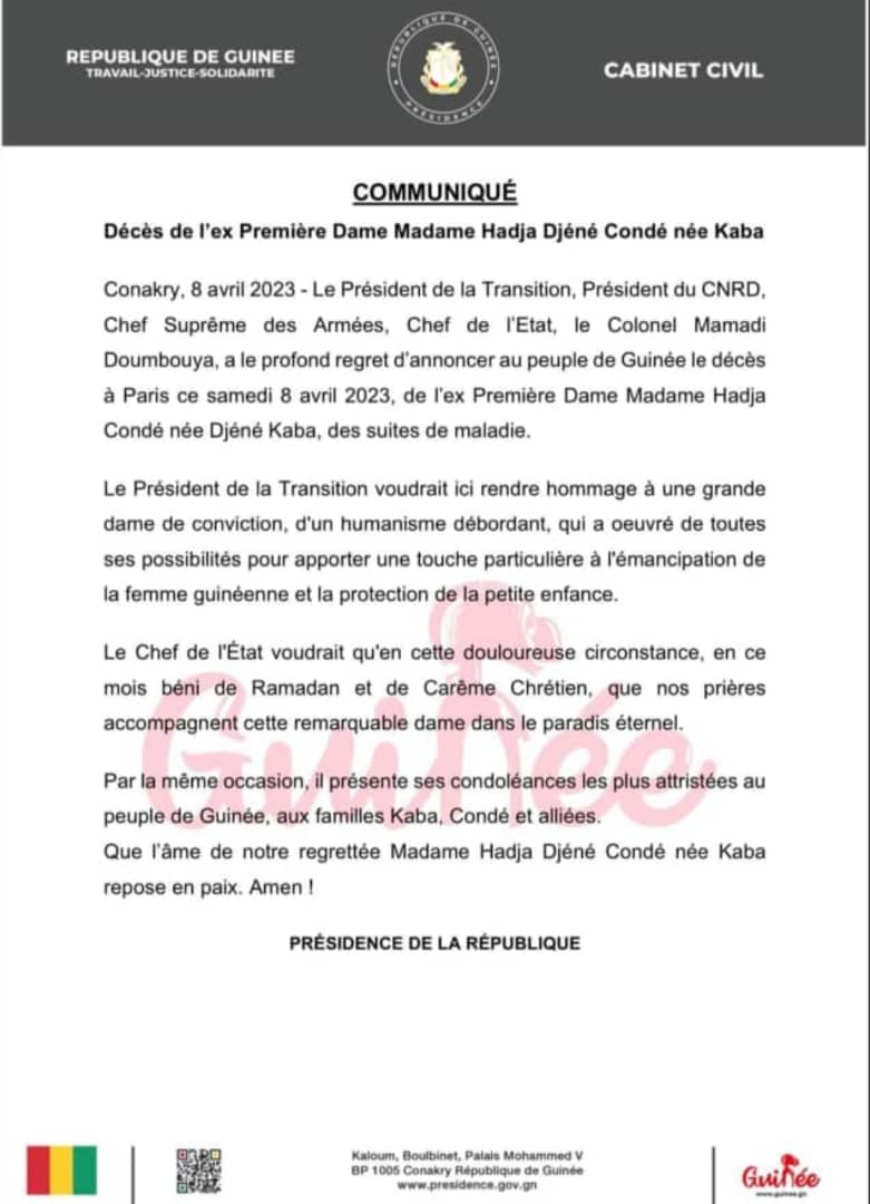 L’ancienne première Dame, Hadja Djénè Kaba Condé, l’épouse de l’ancien président Alpha Condé a tiré sa révérence samedi dernier, des suites de maladie. Le décès est survenu à Paris, dans la capitale française. Une mort qui plonge sa famille biologique, politique, ses ami(es) et connaissances dans la tristesse, désolation et consternation.