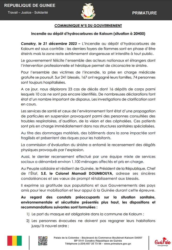 Plus le temps passe, plus le bilan humain s’alourdit, suite à l’incendie survenu au dépôt d’hydrocarbures de Kaloum. Alors que l’on déplorait jusqu’ici 18 morts, le nouveau bilan fait état de 23 cas de décès. C’est le gouvernement qui l’a annoncé dans la soirée de ce jeudi, 21 décembre 2023 sur les antennes de la télévision nationale.