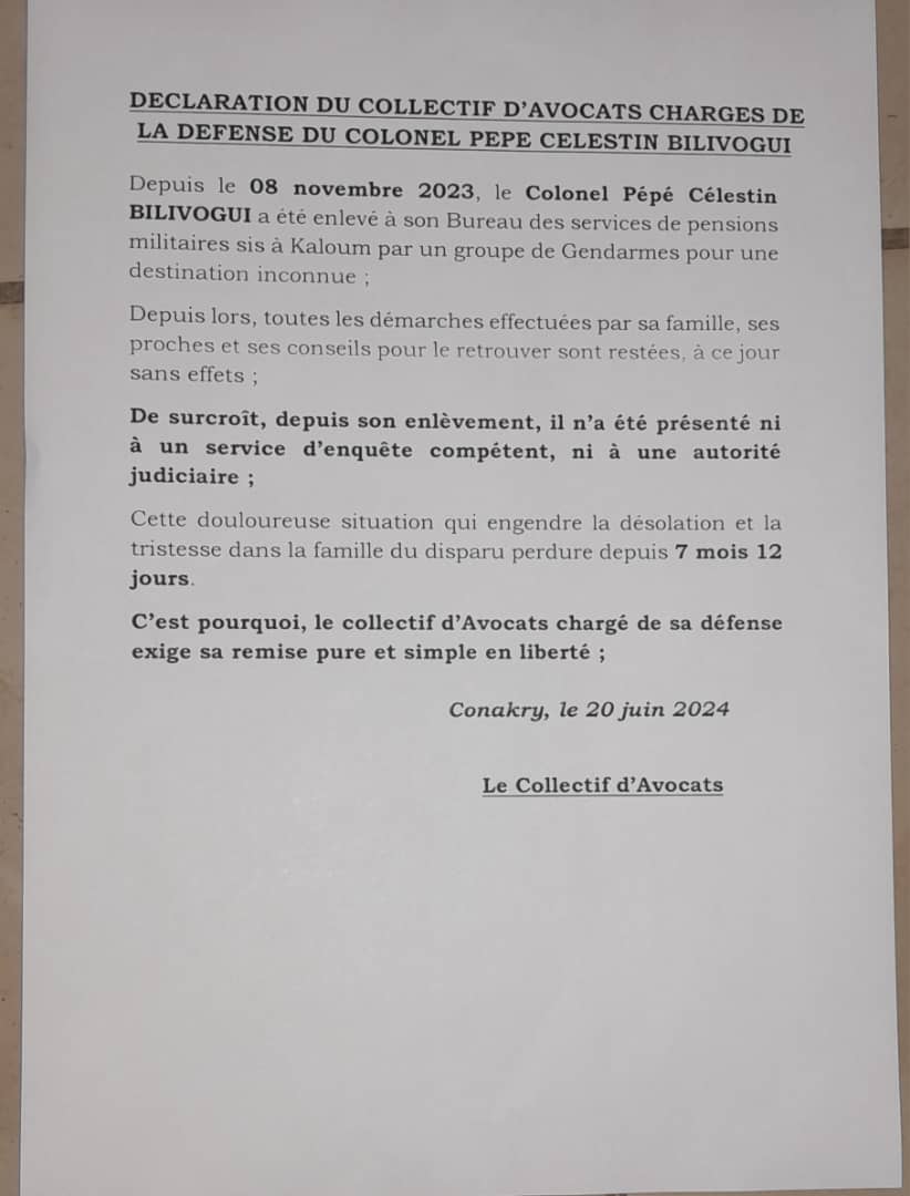 Tard dans la nuit du mardi, 25 juin 2024, une déclaration est parvenue au Desk de Siaminfos.com. En effet, le collectif d’avocats du Colonel Pépé Célestin Bilivogui tire la sonnette d’alarme sur « l’enlèvement » de ce dernier pour une « destination inconnue ».