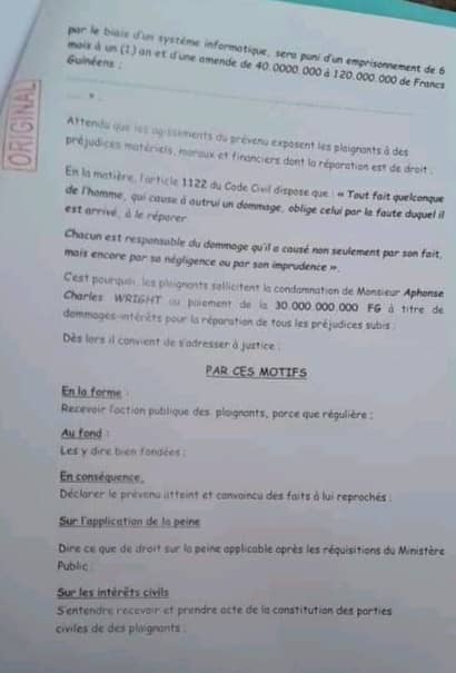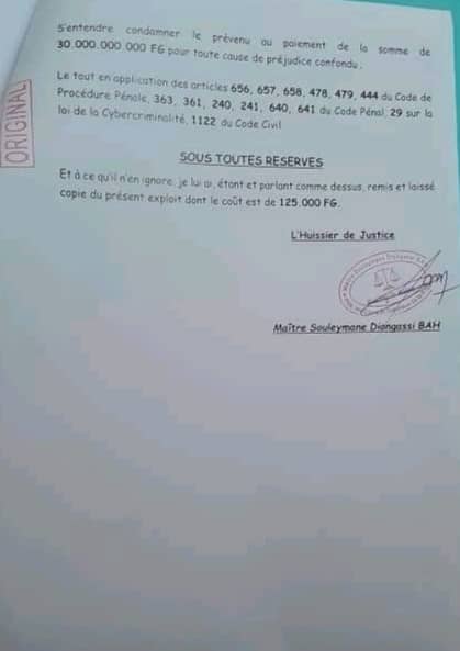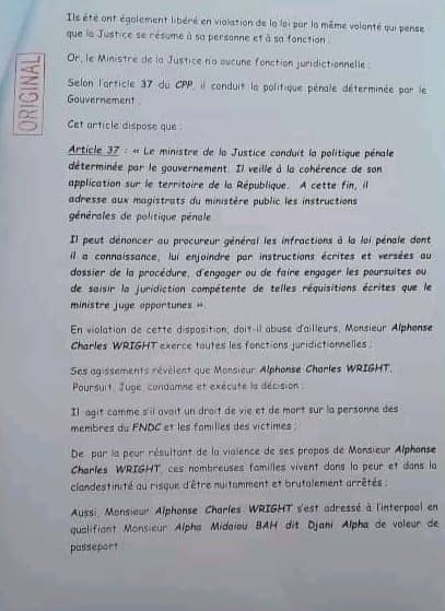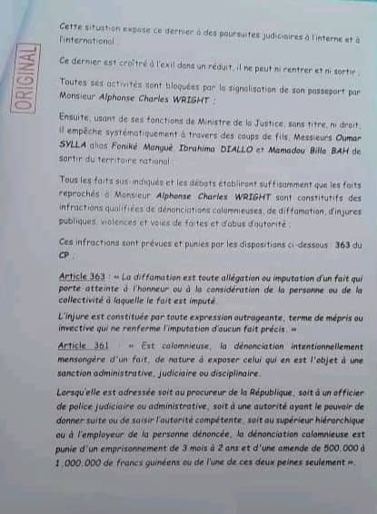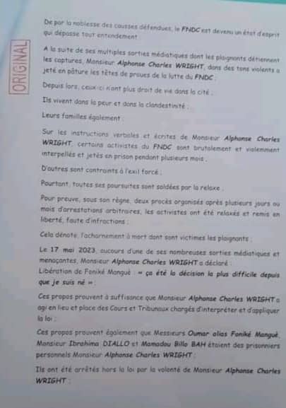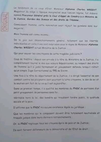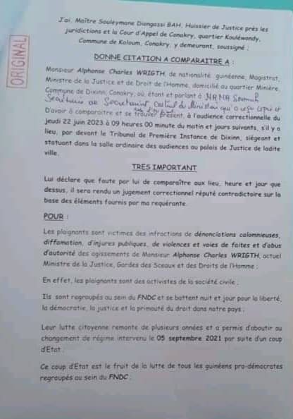Le ministre guinéen de la Justice et des droits de l’homme Alphonse Charles Wright vient d’être cité à comparaître à l’audience correctionnelle du Jeudi 22 juin 2023 à 09 heures du matin et jours suivants, s’il y a lieu, par devant le Tribunal de Première Instance de Dixinn par Oumar Sylla, alias Fonikè Menguè, Billo Bah, Sékou Koundouno, Abdoulaye Oumou Sow et Djanii Alfa, tous responsables du FNDC.