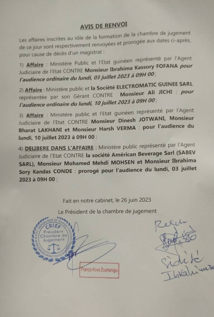 Toutes les affaires inscrites au rôle ont été renvoyées pour cause du décès de l’ancien président de la Cour d’appel de Kankan. Le procès dans l’affaire Dr Ibrahima Kassory Fofana a été renvoyée au 03 juillet 2023.