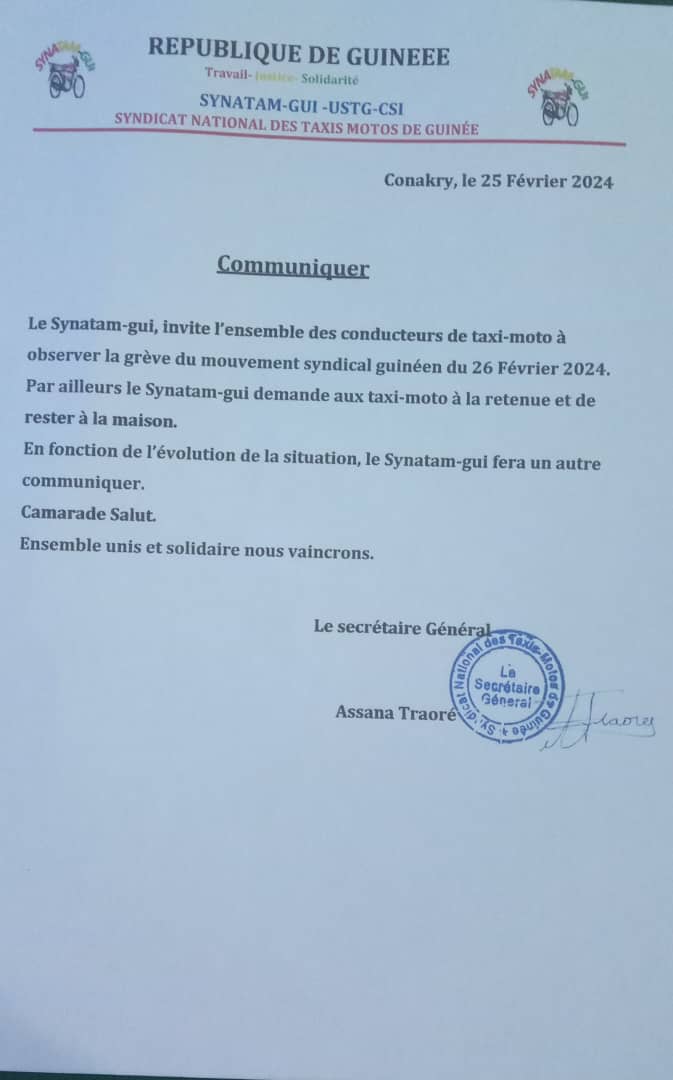 Après plusieurs associations syndicales, c’est au tour du Syndicat national de taxi-moto de Guinée ( Synatam-gui) d’invite l’ensemble des conducteurs de taxi-moto à observer la grève du mouvement syndical guinéen du 26 Février 2024.