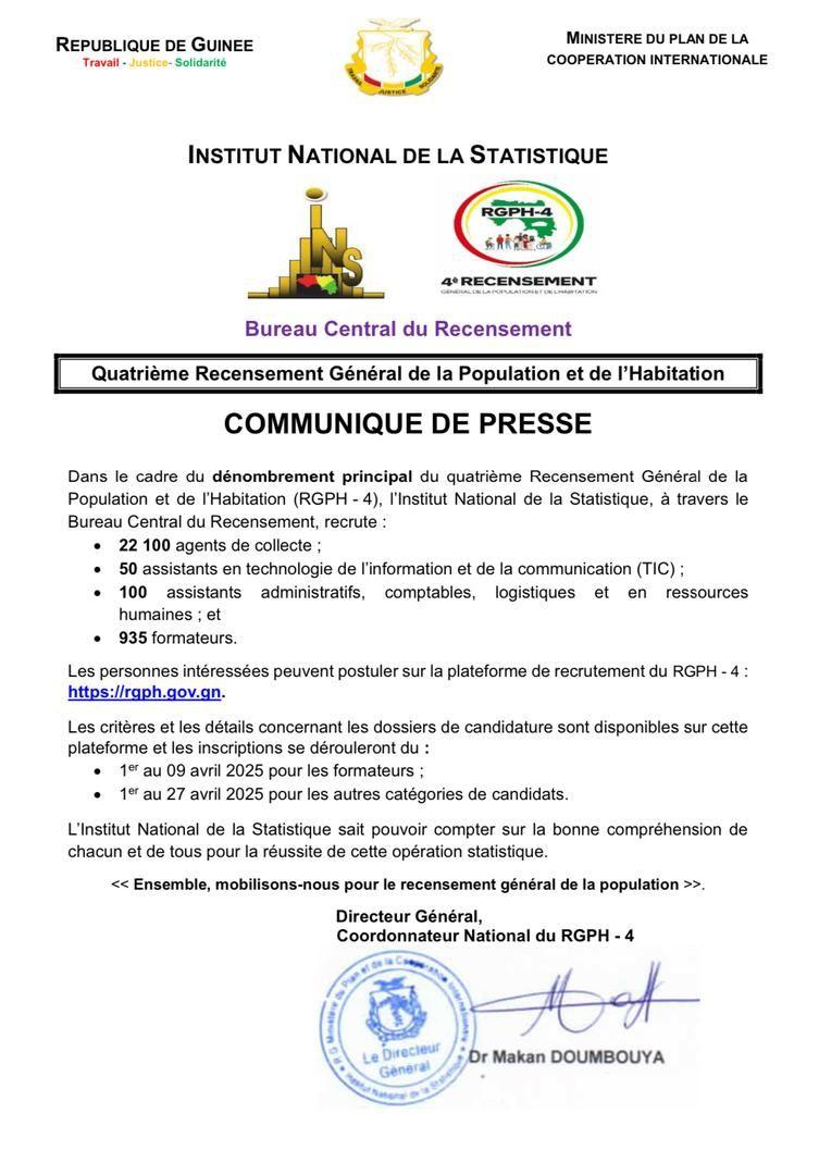 Dans le cadre du dénombrement principal du Quatrième Recensement Général de la Population et de l’Habitation (RGPH-4), l’Institut National de la Statistique (INS), à travers son Bureau Central de Recensement, annonce le lancement d’une vaste opération de recrutement sur toute l’étendue du territoire national.