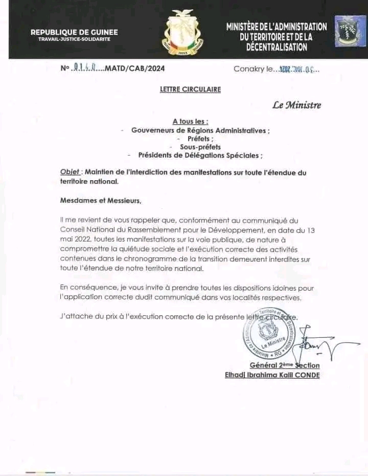 Maintien de l’interdiction des manifestations en Guinée : le ministre Ibrahima Kalil adresse une lettre circulaire aux administrateurs territoriaux
