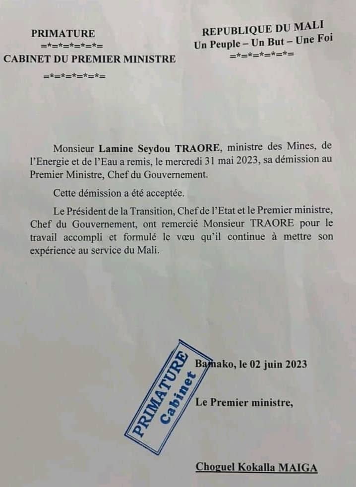Dans une note en date du 02, juin 2023, la Primature malienne a informé l’opinion de la démission du gouvernement de la transition de Lamine Seydou TRAORE, ministre des Mines, de l’Energie et de l’Eau, sans donner plus de détails sur les raisons.