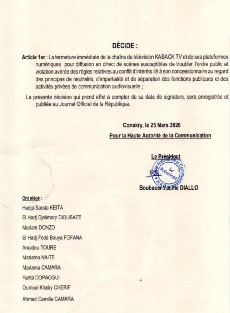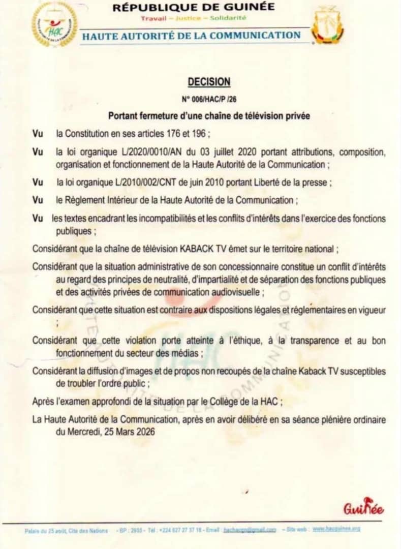 La haute autorité de la communication ordonne la fermeture immédiate de la chaîne de télévision Kaback TV. La décision est tombée ce mercredi, 25 mars 2026. L’organe de régulation des médias en Guinée reproche à cette télévision d’avoir diffusé des images et audio non recoupés susceptibles de troubler l’ordre public. Une violation selon la HAC, qui porte atteinte à l’éthique, à la transparence et au bon fonctionnement du secteur des médias dans le pays.