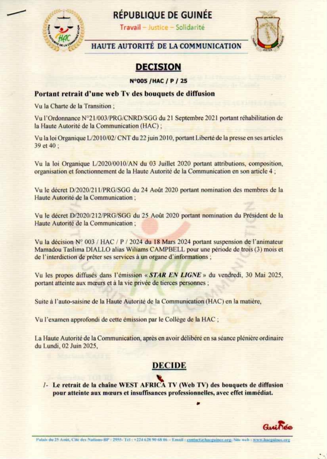 C’est une information qui nous est parvenue dans la soirée de ce lundi, 2 juin 2025. La Haute Autorité de la Communication (HAC), instance de régulation des médias en République de Guinée, a décidé du retrait de la télé web WEST AFRICA TV des bouquets de diffusion Canal Plus Guinée et Startimes Guinée. Ce, à compter de ce jour (lundi, 2 juin 2025). La HAC reproche au média « l’atteinte aux mœurs et insuffisances professionnelles, avec effet immédiat ».
