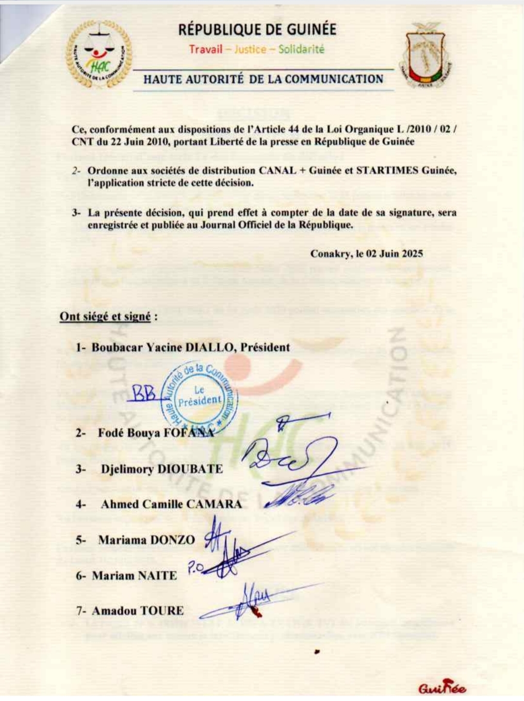 Dans la note dont Siaminfos.com détient Copie, la Haute Autorité de la Communication ordonne aux sociétés de diffusion Canal Plus Guinée et Startimes Guinée, l’application stricte de cette décision.