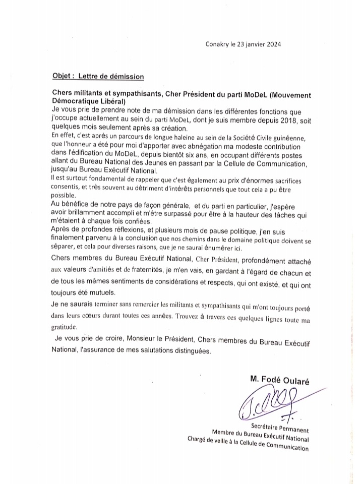 Dans une lettre parvenu au desk de Siaminfos.com en date du 23 janvier 2024 et déposée il y a quelques jours seulement à la Direction du parti nous apprend-on, Fodé Oularé le désormais ancien Secrétaire Permanent du Mouvement Démocratique Libéral (MoDeL) nous a annoncé sa démission au sein du parti dirigé par Aliou Bah.