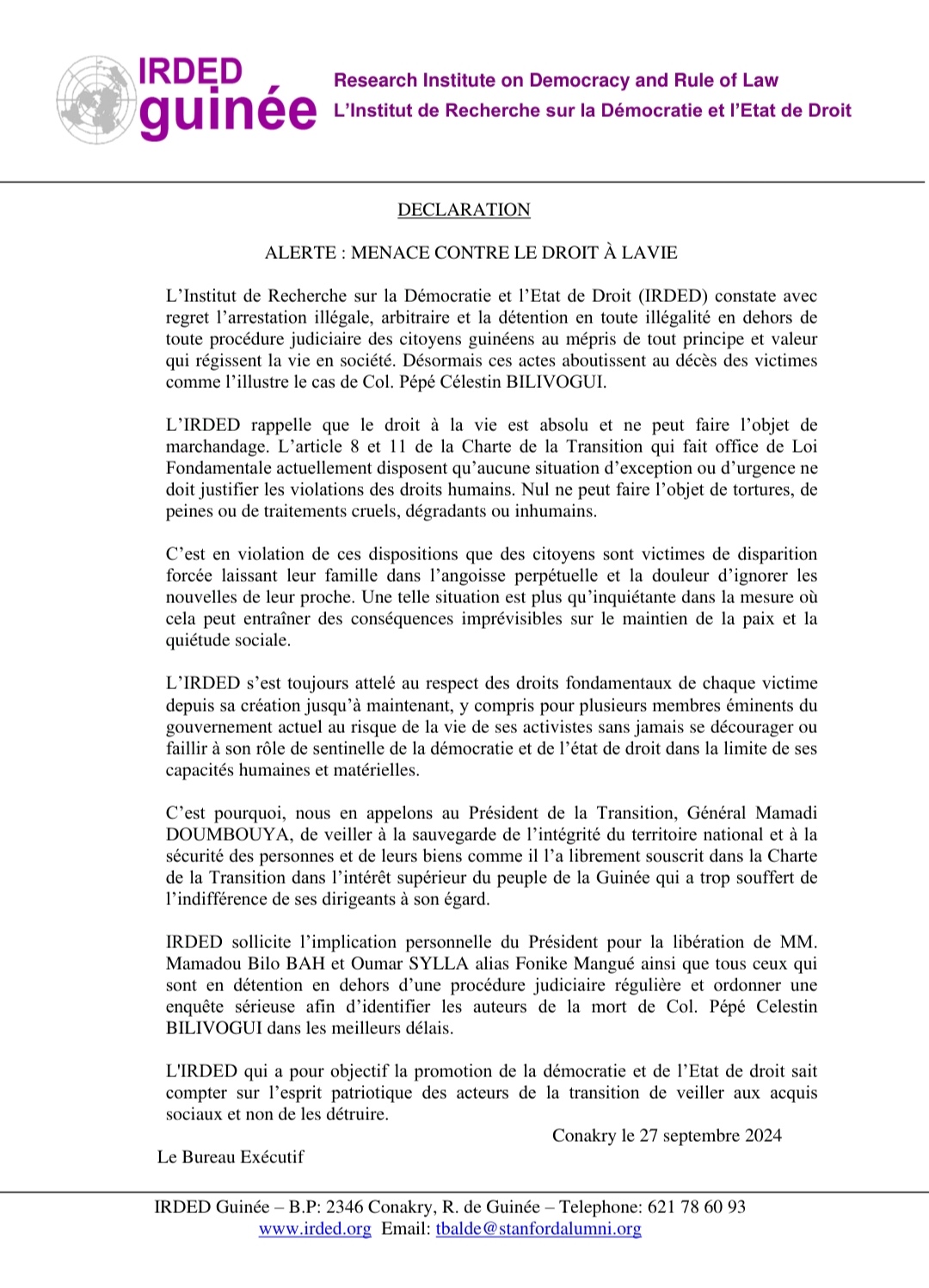 Après les déclarations du forum des Forces Sociales et le Barreau de Guinée, c’est au tour de l’institut de recherche sur la démocratie et l’État de Droit de hausser le ton contre la mort suspecte du colonel Célestin Bilivogui et l’enlèvement des responsables du FNDC, Foniké Menguè et Billo Bah. Dans une déclaration dont Siaminfos.com détient copie, l’IRDED alerte sur la menace contre le droit à la vie et invite les autorités à rendre justice dans le cas Célestin Bilivogui et de tout faire pour retrouver ces activistes de la société civile.
